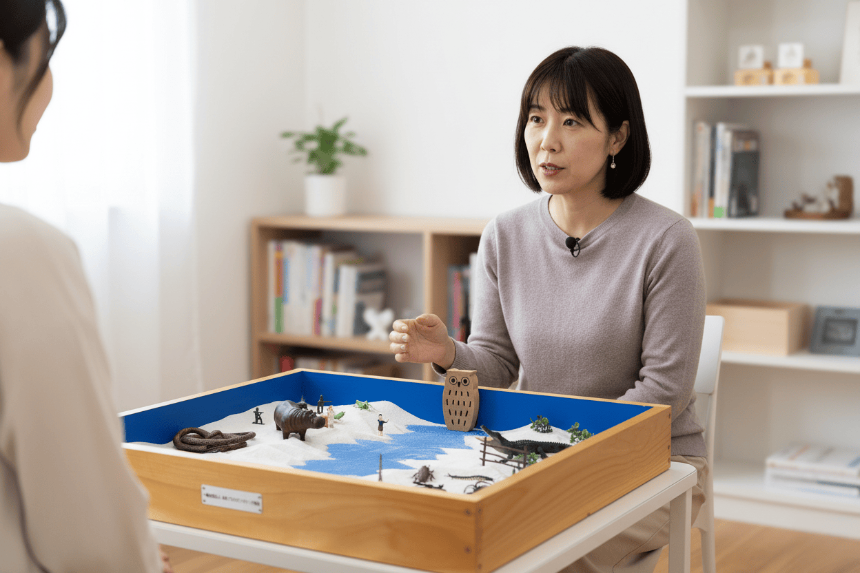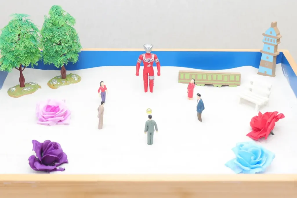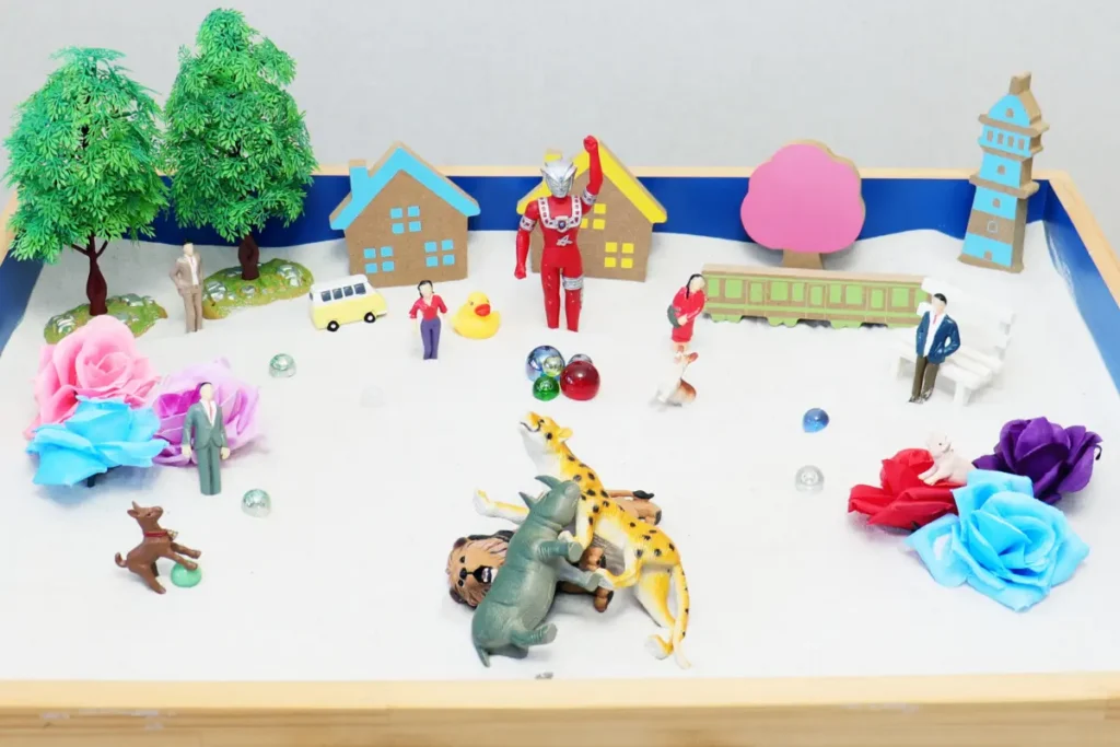 箱庭療法は、砂箱にミニチュアを並べて言葉にできない感情や心の状態を表現する心理療法です。